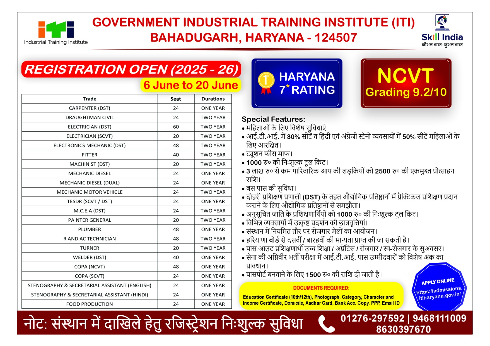Student seeking for admission in ITI should check ITI Bahadurgarh Website in the month of August onwards. All relevant information about admission will be available on website.